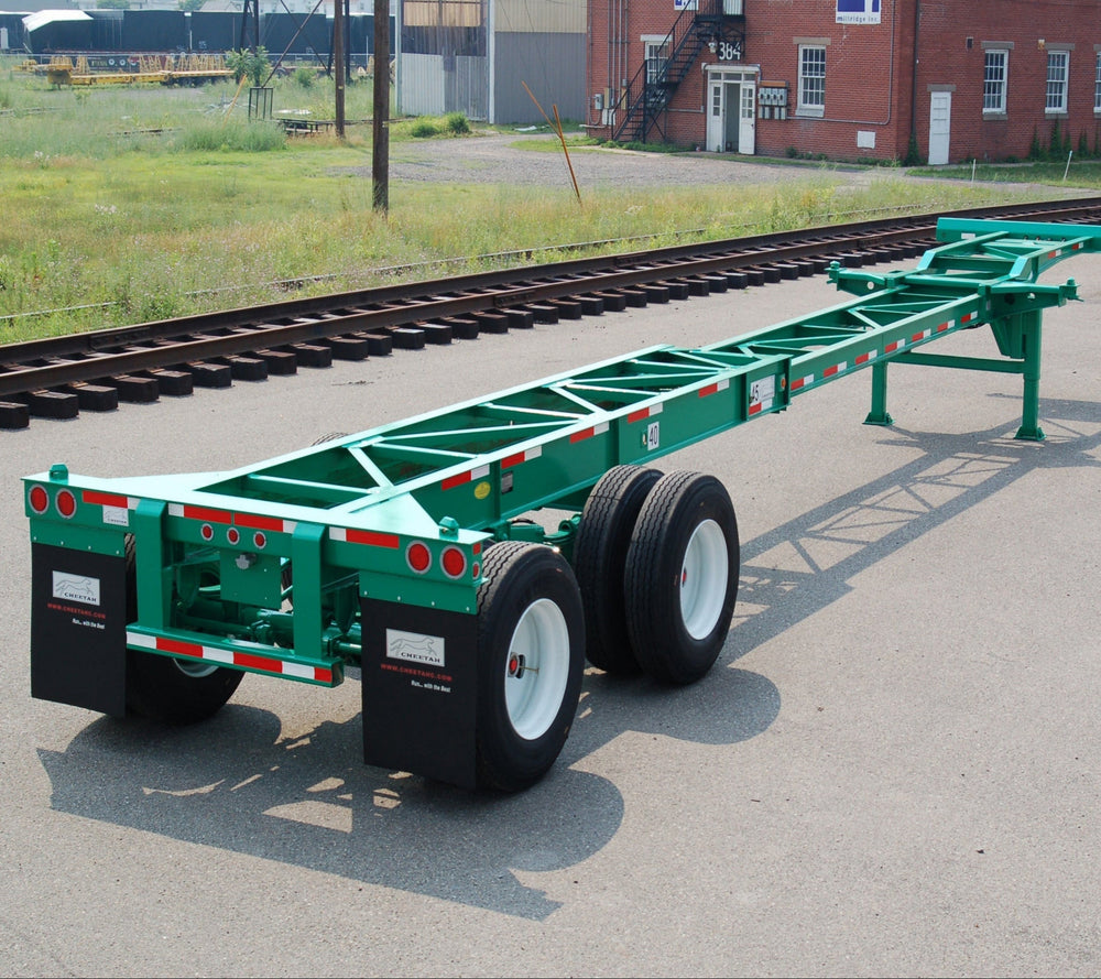 This chassis can carry one 40 ft. container, one 45 ft. container, or one 20 ft. container.